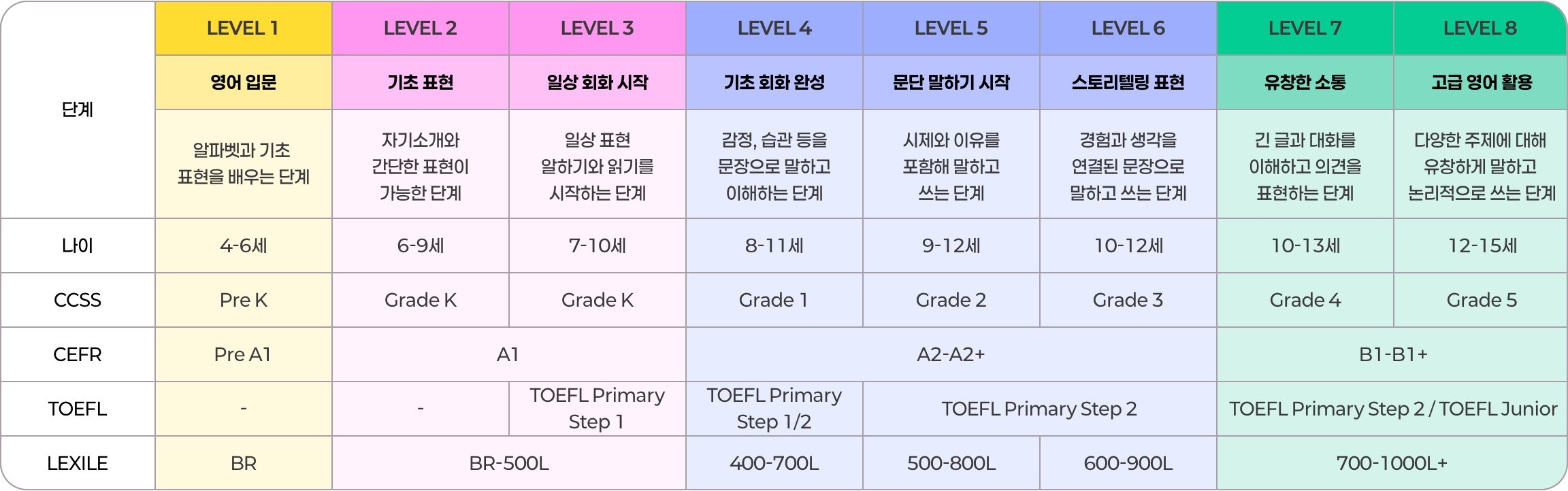 정규수업은 미국 공교육 기준(CCSS)과 유럽언어기준(CEFR)에 따라 8단계 커리큘럼으로 구성되어 있어요.